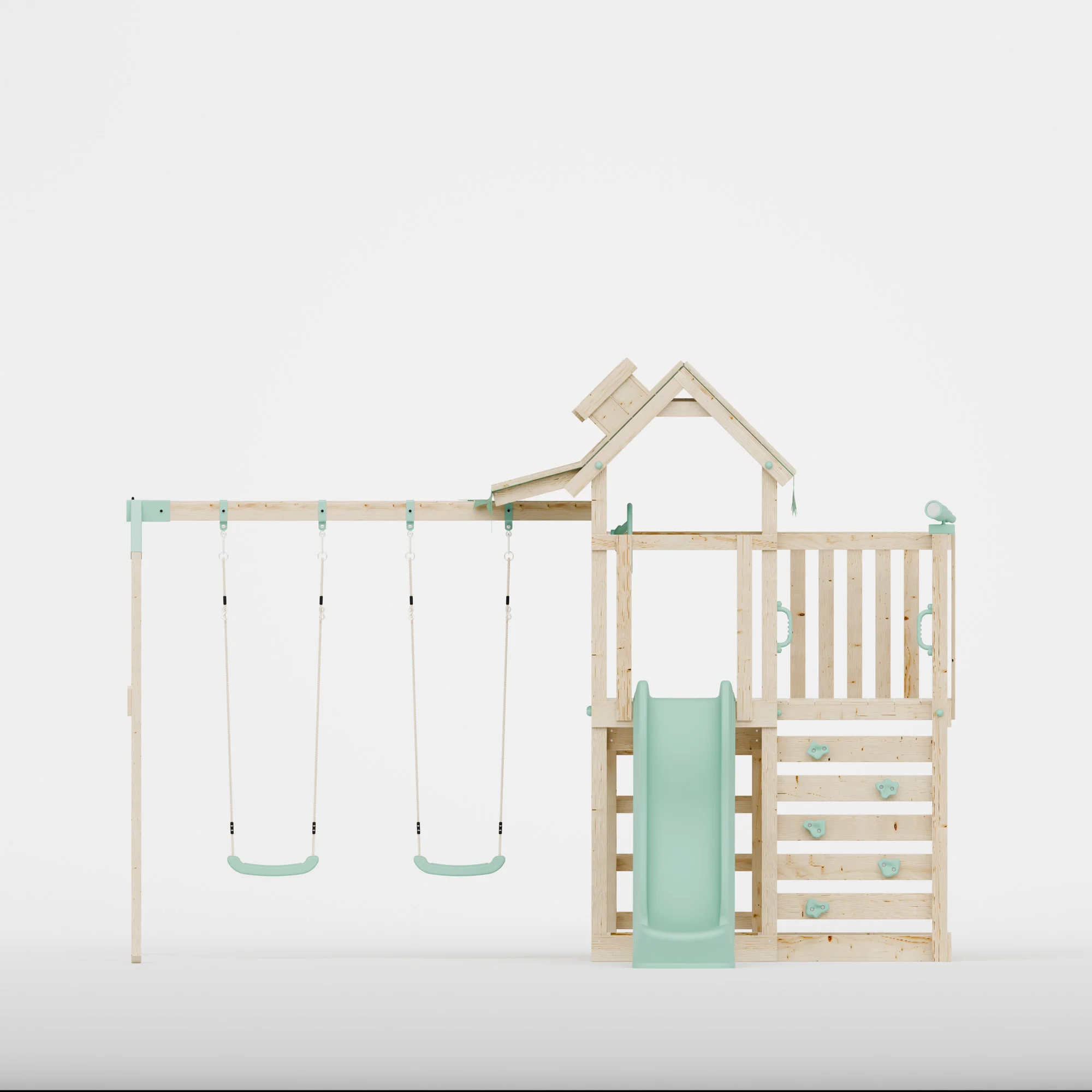 Create lasting memories with the Eldertree Forest Climbing Frame, a beautifully designed outdoor playset which combines imaginative play, safety and sustainability. Featuring a charming pastel slide and double swing, it brings a calming, modern aesthetic to any garden.