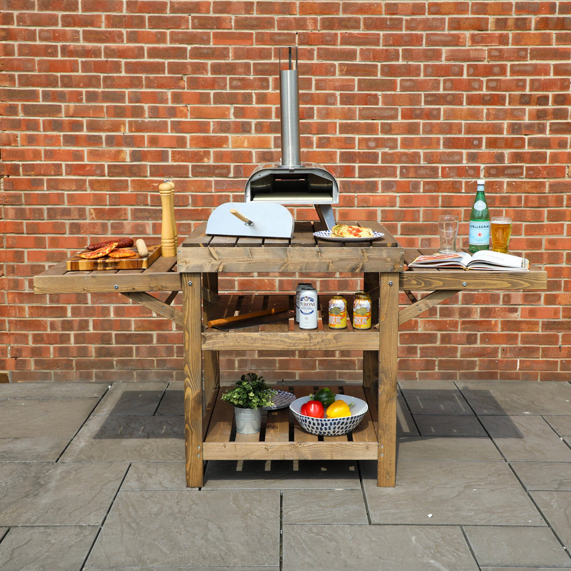 Practical and aesthetically pleasing, this outdoor table is created for functionality for the perfect outdoor cooking station. The robust structure securely supports the weight of a pizza oven and cooking equipment. Designed for easy accessibility, the side panels can be lifted and secured in seconds, while the secure shelves can be utilised from all angles.